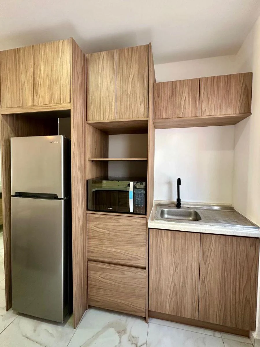 – Cocina integral de diseño minimalista/ Incluye refrigerador, microondas, cafetera y licuadora.