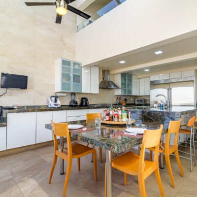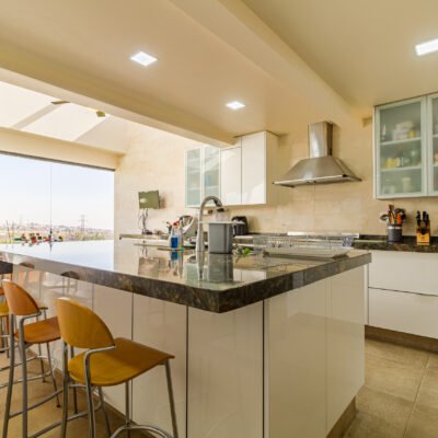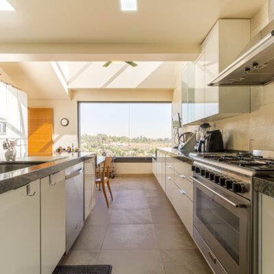 – Cocina integral ( Estufa, horno, campana, amplia alacena/ armario de alacena, isla, lavavajillas, ventilador de techo sobre el antecomedor, placa de inducción, congelador y refrigerador duplex, placas de mármol enormes y en perfecto estado )