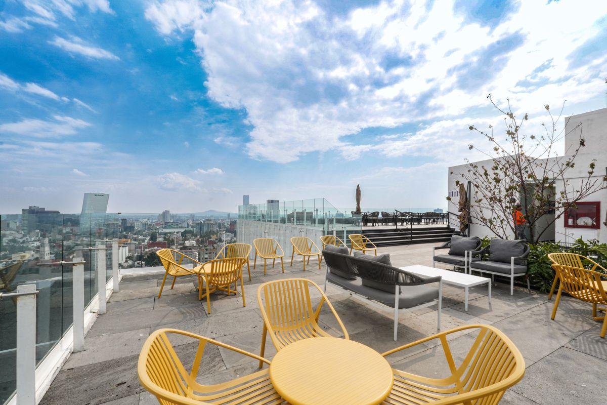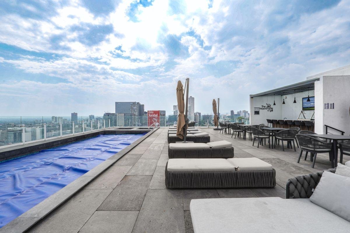 Áreas comunes: Rooftop con jardines, alberca, asadores, barra lounge, terraza y palapas,